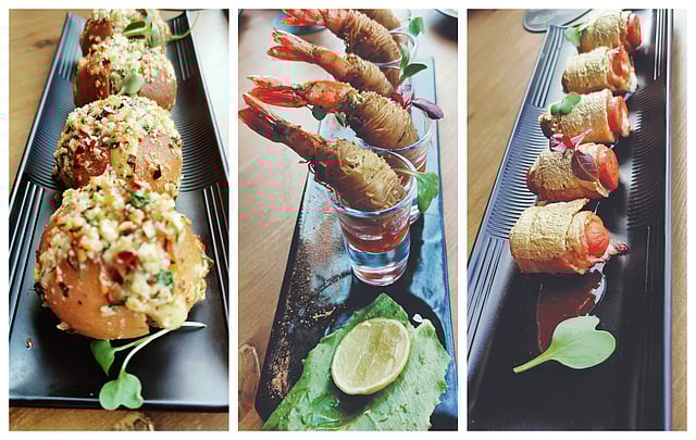 “Post pandemic there is a big demand for open spaces — But Sky Brew is more than just a rooftop restobar. It is also the answer to a contemporary dining space that offers signature dishes with emphasis on global flavours and a chic vibe,” says Praveen even as we bite into plump oversized Kataifi prawns — after all a bar menu is incomplete without a deep fried version of a prawn tempura. Another bar favourite that has got a luxe makeover is the pigs in the blanket. We jab into succulent rolls of Gold Wrap Onion and Cheese Chicken Sausage. Yes, it is gold dusted. As you digest that — the buns arrive. The Korean buns are all about the cream cheese stuffing and the garlicky buttery topping — and while it’s trending in the city, this version takes the cake.