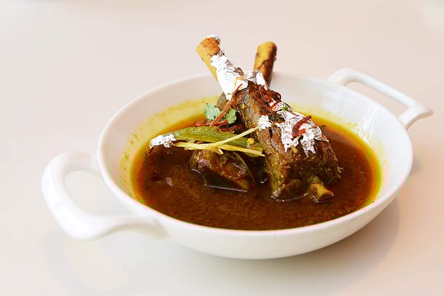 We’re happy for the short wait before our mains arrive. And find ourselves enthralled by chef Vijay’s stories in the meantime. We discover for instance that ‘in Shah Jahan’s kitchen chaat was a non-vegetarian dish!’ Although, we’re keener on the Shajahanabadi Nehari which showcases lamb shin braised with red onions and an aromatic spice mix of potli masala, herbs and meetha attar. The slow-cooked meat quite literally falls off the bone and the brown stew is packed with flavour. We savour this alongside the delicate notes of the aforementioned Moradabadi Murgh Biryani cooked dum-style. Quite the opposite of decadent and heavy, as one would expect with a wedding biryani, this preparation is more like a comfort meal for the weekend. However, the piece de résistance turns out to be the Lucknavi Murgh Korma. Simmered in caramelised onions, cashew and chironjee — this dish has us returning for refills... more than once.