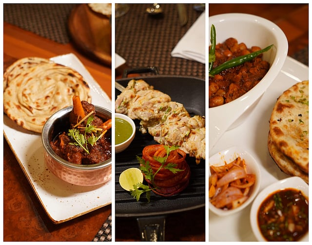 The menu offers Kesar alli lassi, Paye da Shorba, Makkai da ras, Bhatti ka murgh, Amritsari machli, Hare matar di tikki, Aachari paneer tikka, Makki Di Roti te Sarsoon da saag live, Kadai paneer, Hing dhaniye de chatpate aloo, Chaunke baigan, Ajwaini sookhi subzi, Punjabi Rajma, Kadhi pakora, Moge wala murgh Biryani, Achari machli, Tawa seekh masala and Matar ale chaul. Also look out for a Tawa Meat Parantha station, Bhatti/Tawe ton, Makki di Roti, Amritsari kulcha, Lacchi Paronthi, Choor choor naan, Phulka, Poori and the desserts consist of Gulkand ki rasmalai, Besan di barfi, Boondi de ladoo, Pinni, Gajrella, Thoothi, Jalebi and Moong dal halwa.