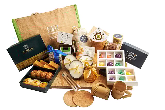 The Diwali hampers from Four Points by Sheraton Mahabalipuram Resort & Convention Center have been named 'The Orchestra of Celebrations' for the year 2023 and they comprise four different versions. Named Eco-friendly, Sustainable, Recycled and Domestically Sourced, these hampers come with eco-friendly and sustainable packaging. They cost between INR 3,500 and INR 10,000.