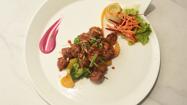The Mala prawns with chilli oil, crispy and bursting with flavour, was a street-food masterpiece. Ginger, garlic, and a medley of sauces created a flavour symphony in perfect harmony. But the stuffed mushroom dominated the starter course. Imagine, delicate mushrooms filled with a vibrant mix of greens, then deep-fried and tossed in a tangy, spicy dragon sauce. The vegetables added a delightful texture, making for a truly memorable dish.