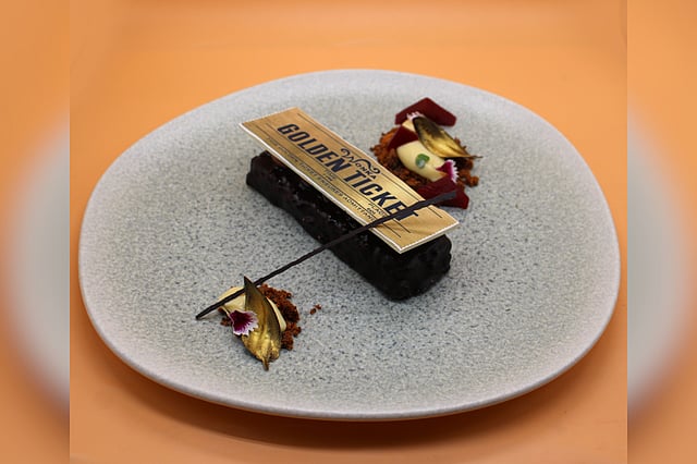 For dessert, we tasted a creative version of the Golden Ticket, the McGuffin from the 1971 film Willy Wonka and The Chocolate Factory. The silky French chocolate presented some bitter undertones of dark chocolate upon which lay the ‘Golden Ticket’ printed on white chocolate. The peanut crunch coat gave us a nice roasty undertone, while the raspberry jello paired with the chocolate filled our sweet tooth for the day with ease.