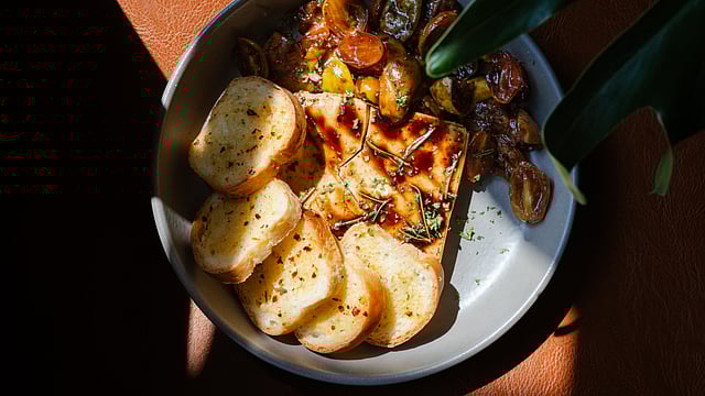 The Baked feta salad arrives as a massive chunky slab of cheese with sweet figs and roasted cherry tomatoes coated completely in a balsamic glaze paired with crostini. You can scoop, spread, or just admire how much it looks akin to a cheese board.