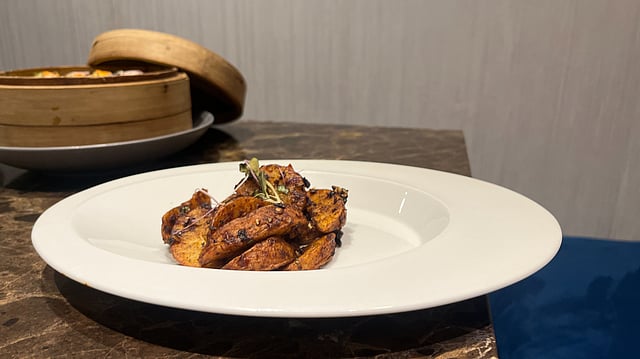 Wok-tossed potatoes arrive looking like they’ve had a glow-up, crisp-edged wedges in their golden jackets, tossed in spices, sesame, and XO chilli oil. Crunchy even when cold.