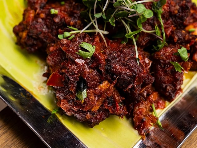 The seafood made its entrance with Meen moilee (fish moilee), where turmeric sang louder than anything else. However, the tender, fresh fish and the mellow coconut milk in the moilee compensated for it. The Prawns roast, on the other hand, was bold and was prepared in true Kerala style. The spices clung to each bite—rich, and satisfying.