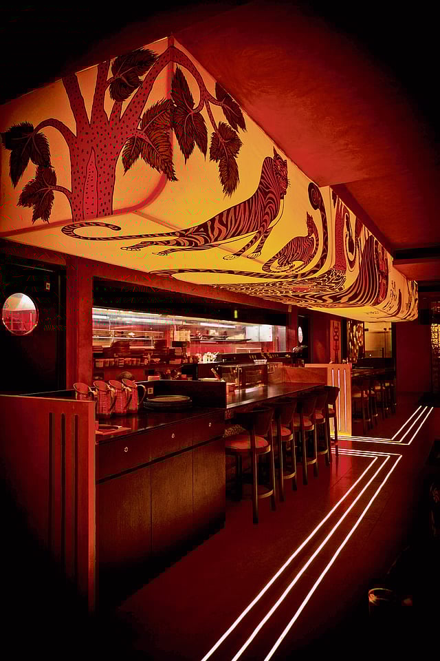 The moment you enter Fu Fu, you are greeted by a wall of mirrors. That is the only time you can see yourself – the rest of the restaurant is based on the Sumatran tiger, right from the long running bar counter to the lamp shades. The interior is dim lit to emphasise warm and cosy interiors and a custom printed upholstery motif based on – you guessed it, the Sumatran tiger.