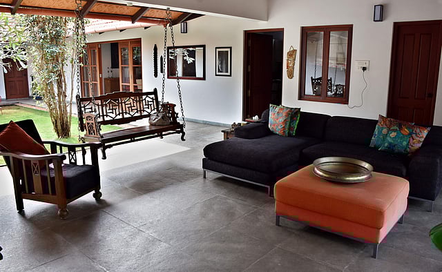 Designed to reflect their Malayali-roots, Lilypool roughly follows the traditional Tharavadu aesthetics with a central courtyard. But, our eye quickly travels to the large French windows that give you the sense of a house without walls — a space without barriers. Almost everything about this villa overturns convention. After all, most homestays outside the confines of the city depend on the scenic view for their primary appeal. For this home that sits on a 32-acre farm, the allure lies in its ability to play with natural light.