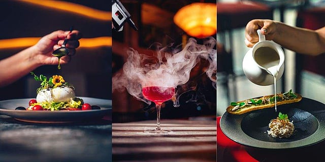 We sipped the drinks with a lavish line-up of starters beginning with Black Bean Chicken. The fresh juicy chicken pieces tossed in house sauces, crusted with peanuts and topped with glass noodles added the much-needed munch alongside the drinks. For street flavours, we indulged in Blueberry Papdi Chaat. It was crafted with a twist lent by the lavender-coloured blueberry paste added to the usual mix of dough chips (papdi), chopped potatoes, puff rice, chickpeas and pomegranate.