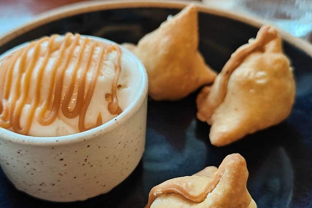 We rounded off the experience with desserts Khubani Hyderabadi Tres Leches, Liquid Cheesecake with Osmania Biscuits and Jaggery and Coconut Samosa with Salted Caramel Sauce and Gelato. By combining the flavours of khubani (apricot) with tres leches, the desi dessert has taken a worthy European ride. As for the Liquid Cheesecake with Osmania Biscuits, it is a delicious take on Hyderabad’s love for Osmania biscuits. Lastly, the combination of jaggery and coconut stuffed in a small samosa served with tender coconut ice cream, and topped with salted caramel sauce made it a fitting end to our luncheon.