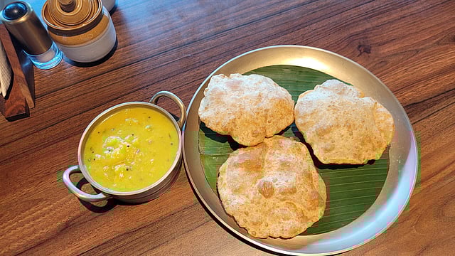 The Ghee podi onion dosa and the Garlic karam dosa arrived with a bucket of chunky sambar. The Ghee podi onion dosa had a raw onion filling in it. While the taste of the onion was very prominent, the podi was on the subtler side. The Garlic karam dosa, on the other hand, had a spicy taste, thanks to dry spices with a garlicky flavour at the end. Both the dosas were accompanied by a tangy sambar. The Poori with aloo sagu came with a semi solid potato sabji with minimal spices. Along with the poori made of wheat, the meal had a rather comforting taste due to the lightness of its flavours.