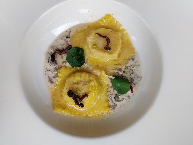 For those of us whose dining out scene isn’t complete without Asian food, we’d recommend the Sea pearl dumplings with coconut prawn and green chilli. The piping hot dumplings were simply god-sent on the gloomy day. From the Red Rhino Concoctions, we tried the Screwball old fashioned, which was a fun take on the classic cocktail. With floral honey and cheesecake syrup, the drink topped with an orange rind uplifted our senses with every sip. We paired the concoction with the Mutton filo pie. With pulled mutton baked in filo pastry served with a decadent bone marrow and caramelised onion based gravy, the standout dish reminded us of another iconic pastry dish of Hyderabad — the Luqmi.