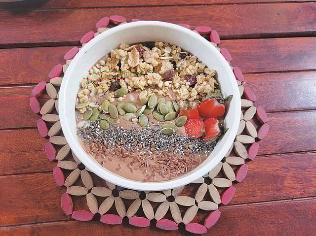Next, to get some nutrition in, we ordered the Choconut bowl, a thick blend of chocolate and banana, with chia, pumpkin, flax seeds, and a generous helping of fresh strawberries. As you can guess, flavour and health went hand-in-hand in this bowl, which felt like absolute goodness.