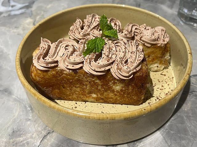 For dessert, we tried the Chocolate French toast, a subtly sweetened option topped with light chocolate whipped cream that was the highlight of the dish.