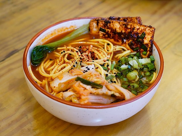 Then came the Japanese ramen, a bowlful of comfort. With noodles, cottage cheese, bok choy, scallions, and a savoury broth, it hit all the right notes. From there, we moved on to Korean favourites, and their kimchi fried rice, one of the bestsellers, stood out. A vibrant mix of spices, sauces, and fermented kimchi, it was as good for the soul as it was for the gut.