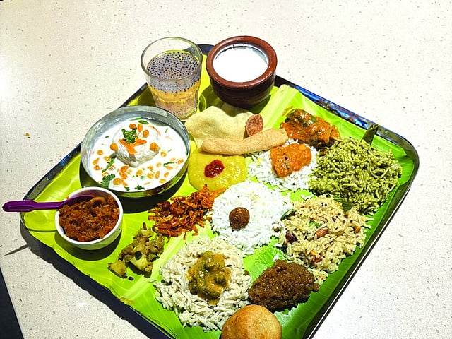 Once comfortably seated, we began with Maharaja bhojanam, a grand thali that truly lived up to its name. Generous and indulgent, the spread was a celebration of authentic Telugu flavours, offering an array of dishes that left us wondering where to even begin. The thali featured multiple types of rice, Gundurao annam, Kobbari annam (coconut rice), and plain white rice, paired with flavourful dals like Tomato pappu and Mudda pappu, and sides like Kotha Avakai (tender mango pickle). The curries included a delicious mix of Aloo karapusa, Aratikaya pidupu (raw banana stir fry), and Vankaya masala (spicy brinjal curry), among others. The comforting Perugu avada, a medley of vadas soaked in curd, was refreshing and well-balanced. The dessert selection was equally delightful, Boorelu (deep-fried jaggery-stuffed lentil dumplings), Annavaram prasadam (a traditional sweet from the Annavaram temple), Gajar ka halwa, and a serving of Kunda perugu (set curd) served in an earthen pot, adding a rustic finish to the meal.