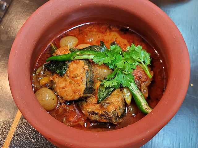 Then arrived the starters, the Banana flower vada was crisp and golden, with lentils and saunf adding texture and depth. It pairs beautifully with the Nethili fry, a plate of tiny anchovies tossed in red chilli and spices, fried until they reach that perfect crunch. We also had the Nei mundhiri kozhi varuval which was rich and warm. Tender chicken was slow fried in ghee with toasted cashews, resulting in a dish that is mellow yet aromatic. On the other end of the flavour spectrum was the Naatu kozhi varutha aracha curry. Here, country chicken was simmered in a roasted masala, creating a deep, layered curry with a fiery finish.