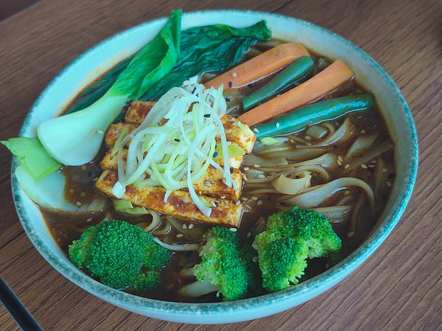 We also tried the black bean ramen, topped with broccoli, spring onions, and spiced paneer fingers. The flat noodles were chewy and delicately soft, well-marinated in the peppery black bean sauce. The sweetness of the soy cut through the spice of the black bean and peppers, giving it an all-rounded flavour profile.