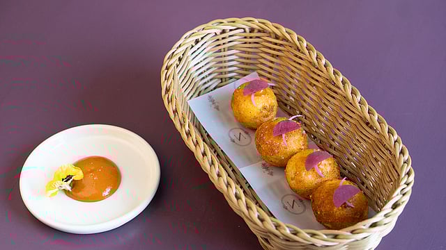 Then came a total curveball: Chicken takoyaki with a Chettinad twist. Think Japanese street food meets South Indian spice—tiny rice batter balls filled with Chettinad inspired chicken keema, topped with ghee powder and ginger chutney. Familiar yet inventive, you could feel the playfulness of the chef.
