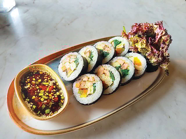Our first choice was the classic Bulgogi gimbap —teriyaki chicken, fluffy omelette, pickled radish,boiled spinach, and carrots, all tightly rolled up with rice and seaweed. The tanginess from the radish, sweetness from the bullet rice, umami from the seaweed, and a hint of freshness from the vegetables—every ingredient brought in a unique flavour. It was nutritious, and we couldn’t stop reaching out for another one.