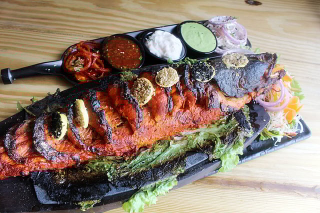 Next up is the visually-appealing Butter Garlic Lobster, which was juicy with a subtle taste of garlic. The Tempura Fried Prawns is crispy to bits. Our favourite, however, is the Murrel Sizzler, which is a sight to behold. By now, we know that plating and presentation is an important aspect that the restaurant pays attention to. The perfectly grilled fish is served with salsa and desi pudina chutney. We loved that it was succulent to the hilt and that it did not have an overpowering aroma.
