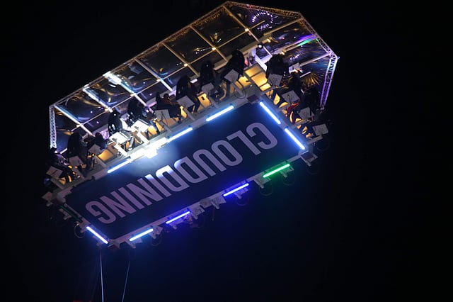 Suspended from a tall crane is a metal platform with aircraft-standard seats and a dining table that can accommodate 25 people around the table and three servers including an entertainer in the centre. Diners are fastened to the chairs with multiple straps for safety. The equipment has been tested and certified from Germany.