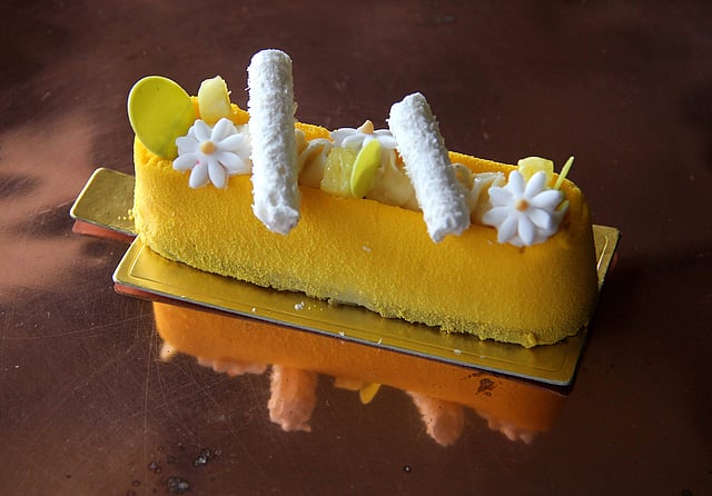 From the pastry section, it’s the Isapahan (raspberry, litchi and rose) that catches our attention first. With a white edible flower and thin wall-like layer of raspberry around the pastry, this pink coloured dessert is of the ‘too-pretty-to-eat’ kind. So we first click a few pictures for Instagram, before digging into it. Although we expect it to be overwhelmingly sweet and heavy, the layered cake doesn’t overpower you with its flavours. Rather, it’s the bright yellow-coloured Exotique that is strictly for those who do not mind a sugar rush, courtesy the rich ripe flavours of mango, pineapple and passion fruit.