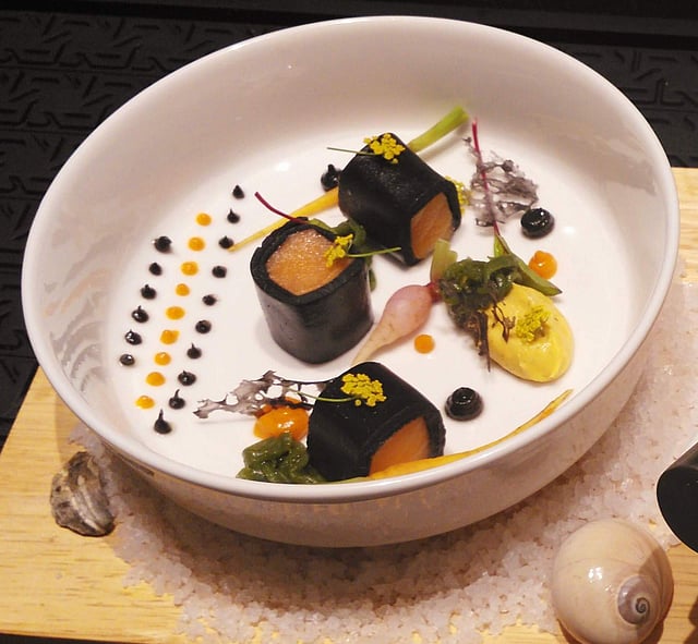 ● In a bowl, whisk rice flour, warm fish stock, and squid ink. Give them a nice whisk, till they reach a paste-like consistency. Then, steam for about five minutes, so that the paste starts to form a film. Cool down this sheet and wrap it around the fish.