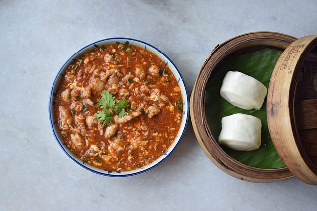We recommend trying the Singaporean chilli crab served with steamed (or fried) mantou buns. The soupy dish, sprinkled with spring onion leaves, is mild and pleasant with sweet and tangy flavours.