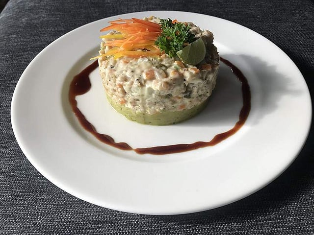 Next up on the serving cards is fish tartar, a cold appetiser. The top layer is a gooey mix of mahi-mahi cubes with vegetables. It is overwhelming on the palate with flavours that I associate with seafood. The base it’s set on— a subtle mix of potato and avocado with pesto sauce—eases the sensation a bit.