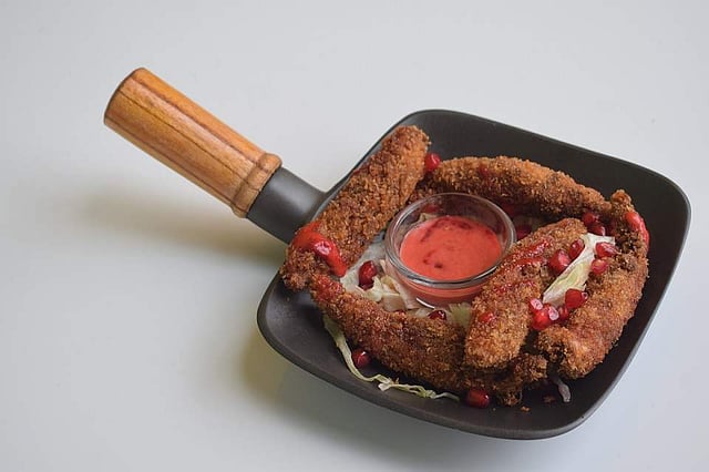 It’d be strange to happen on a section in a menu titled ‘Yo yo’ but the name pomegranate chicken steals my attention faster. Long strips of white meat in peppery panko crumbs are not the attraction of the platter, but the berry-ish sweetness of the pomegranate dip that will entice sweet tooths.