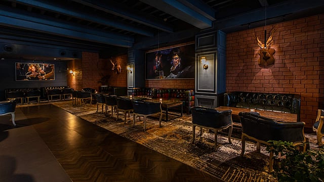 The dark, dimly-lit interiors of the space play a crucial role in setting the tone and ambience. The soft and warm lighting creates an intimate and inviting environment that exudes elegance. The walls are adorned with unique animal art installations that tell captivating stories, adding depth and character to the space while paying homage to the region's heritage and traditions. This authenticity enhances the overall experience, making patrons feel a sense of belonging and familiarity.