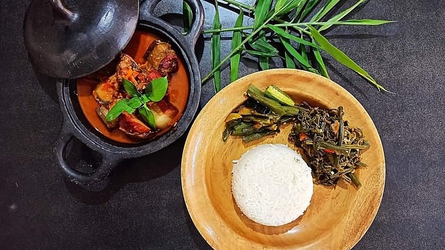 Also try out the Oma Bedor Saonia, a traditional Naga dish featuring smoked pork cooked with fermented bamboo shoots and fiery Naga chili peppers, resulting in a smoky, spicy, and aromatic curry; and Kenie Thevü Gacha, a comforting rice porridge from Nagaland, made with locally-grown sticky rice and served with a variety of toppings such as boiled eggs, vegetables, and pickles, making it a hearty and nutritious meal option.