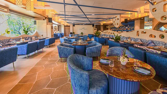 The enclosed ground-floor restaurant is an immersive tribute to the magic of the sea. A visual symphony in myriad shades of blue with fabrics mimicking rippling waves, the design orchestrates a dynamic connection between the surrounding vista, concept and cuisine of the restaurant. The strategically located partitions foster an interactive atmosphere, mirroring the ebb and flow of the tides. The inimitable lattice design on the ceiling, coupled with structured floor stones, adds architectural depth and panache to the overall design.