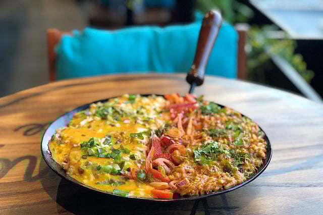 ■ Heat a sizzler plate. Place it on its wooden tray.