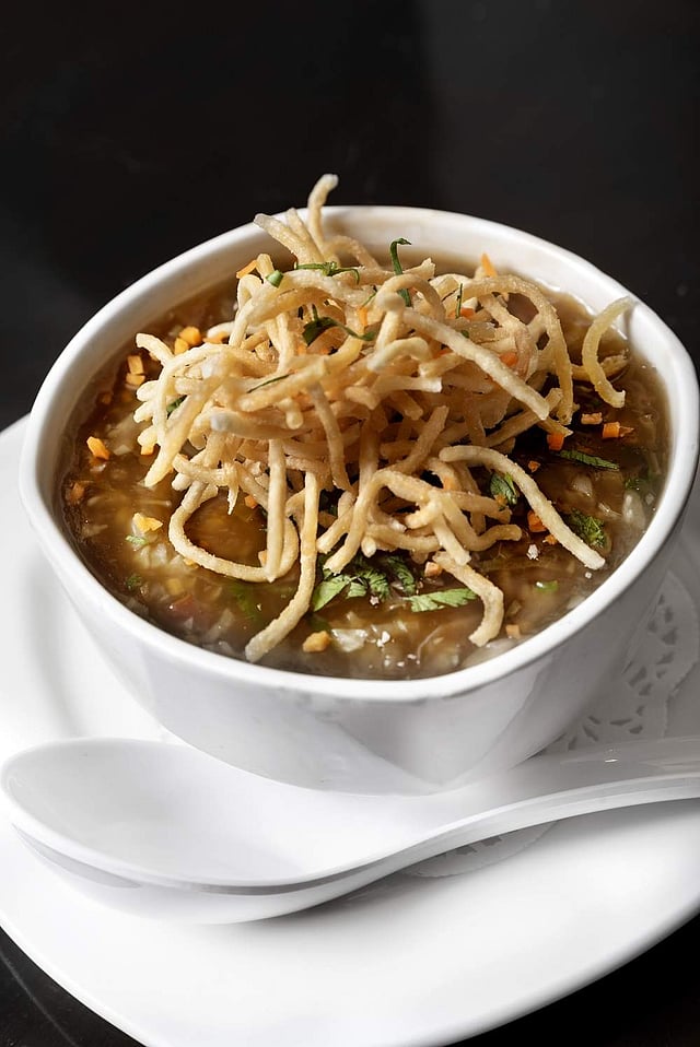 Heat oil in a pan and add chopped ginger and chilli. Sauté for a while. Add salt, pepper. Add one teaspoon dark soya. Add stock water. Add corn flour and boil. Wait for the mixture to become thick. Add egg drop and stir well. Add chicken and vegetables. Add coriander leaf. Add 1 teaspoon vinegar. Garnish with crispy fried noodles.