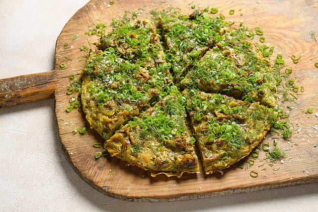 We keep things lighter and more flavorful with Egypt’s spiced frittata-like eggah, which is substantial but balanced, with layer upon layer of flavour thanks to a trio of spices and fresh herbs and scallions.