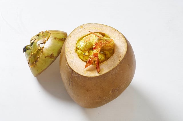 3. Check for taste and put the marinated prawn inside the coconut shell and seal the lid.