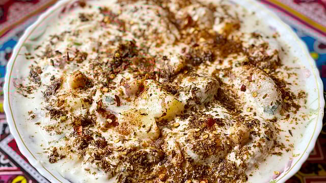 Whisk the yogurt until smooth and add a pinch of roasted cumin powder, black salt, and red chili powder to it.