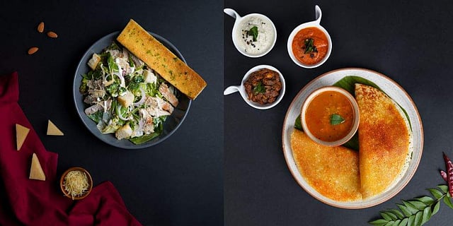 1 salad bar serving vegetarian and non-veg options and Mediterranean dips and breads.