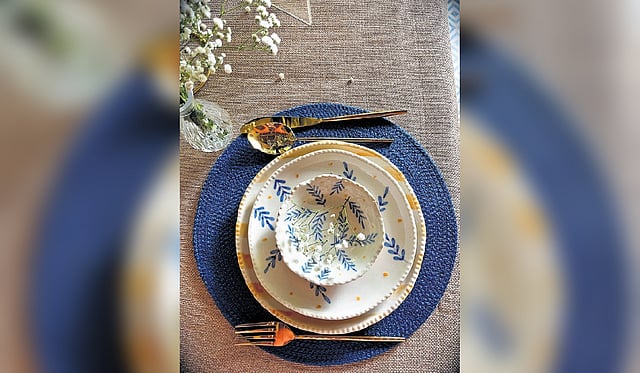 Early records show India’s rich legacy in table décor, from gold and silver tableware used in Maharaja Ranjit Singh’s court to ivory table decoration in the Mysore Kingdom, bronze and copperware with temple motifs used in the Vijayanagara Empire, and ornate table runners used in Rajput kingdoms. The founders of Holm Story drew inspiration from history and travelled to Uttar Pradesh, known for ceramic pottery in hubs like Khurja, Chinhat, and Nizamabad, to craft their pieces. “During the Mughal era, Babar and Akbar found clay in various parts of Uttar Pradesh and realised they could make crockery out of it. When you visit the factories from Delhi to Agra, artisans will tell you how they’ve been making such ceramics and pottery items for generations,” Agarwal adds, sharing that she found artisans from Khurja for Holm.