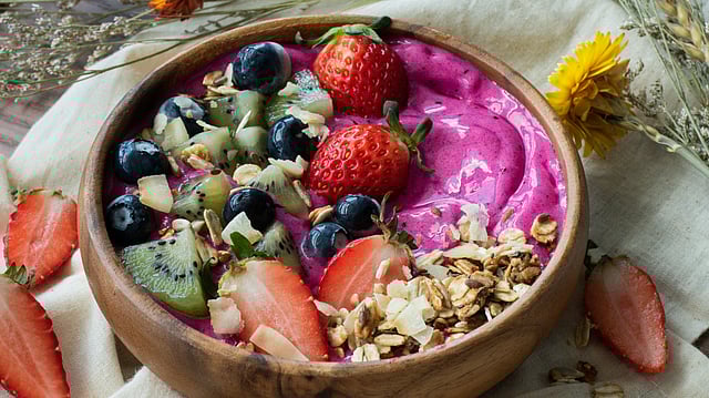 Fruits are perfect for breakfast, but simply eating them can get boring. Add some zest by making a fruit salad. Buy a variety of fruits like strawberries, raspberries, grapes, apples, and bananas. Chop and mix them in a bowl. For extra flavour, add yogurt and cream, or use orange juice, lemon juice, or maple syrup for dressing. A delicious and easy fruit salad is ready to enjoy!
