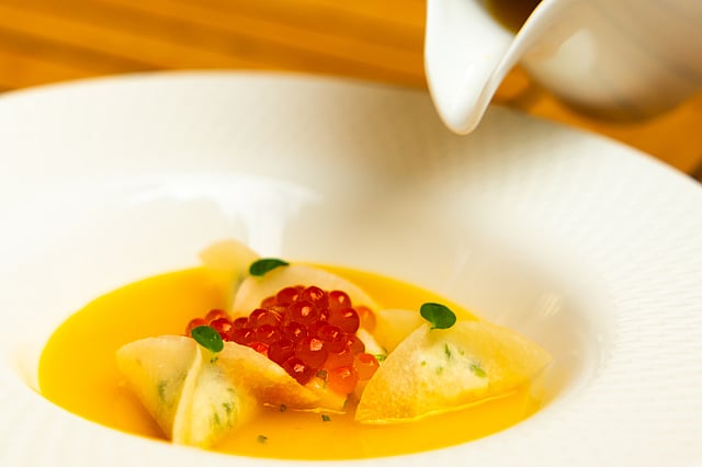 The dinner menu began with the Jicama & Coconut Malai Momo with passion fruit thukpa for the vegetarians along with an added Trout Roe for the non-vegetarians. The first course was inspired by Ladakh’s momo and thukpa culinary culture with its one-bowl balanced flavours.