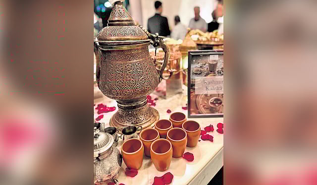 Chef Ahmed began his career by preparing Wazwan for Kashmiri weddings. “Kashmiri weddings are among the most beautiful and elaborate. Traditionally, we use wood-fire and copper vessels to prepare the food, which is then served on a trami — a large, copper plate filled with rice and a selection of meats. Groups share a meal from a single plate. I believe everyone should experience this tradition at least once in their lives,” he says with sparkling eyes showing us a few pictures of him sitting on the ground and preparing Wazwan for weddings.