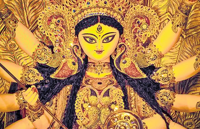 Here, the bylanes are dotted with makeshift stalls selling bright red dupattas with golden gotas that will adorn the idols of the Durga. You see coconuts stacked up to the brim across stores, while the barley grain sits aplenty in baskets.