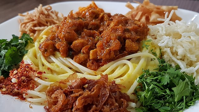 Khow Suey is an original Burmese dish made with egg noodles and cooked in a coconut curry sauce with chicken or meat. The dish accompanies with onions, eggs, lime, chilies, and herbs. The dish was modified as it entered Gujarat and became less watery and the base sauce became thicker. Other ingredients were added such as gram flour and yogurt for creaminess and papdi for the crunch. In addition, peanuts and spicy chutneys gave Khausa its signature heat and tang.