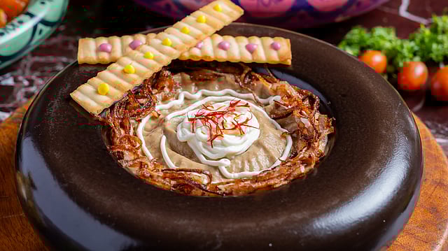 The mains comprised Maqluba al-Dajaj (Middle-eastern chicken and rice) and Zereshk Polo (saffron-infused rice with Iranian berries) – both served with tagine sauce. Here, too, we loved the vegetarian option more, with Zereshk Polo balancing itself well between sweet and savoury.