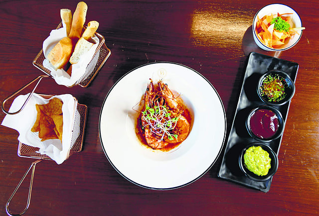 To start with, we sip on a casual mix of in-house pineapple toddy and some freshly tapped brew. Tod’s Weizen is reminiscent of a tepache and makes for an elegant backdrop for the flavoursome and juicy platter of ribs that accompany it. The large, plump, grilled prawns come with the shell but the butter garlic has seeped into the sweetish meat perfectly. We pair this with a Monk Beirita. With a mild taste of Old Monk rum and hints of sweet peach, this one scores high on the potent scale.