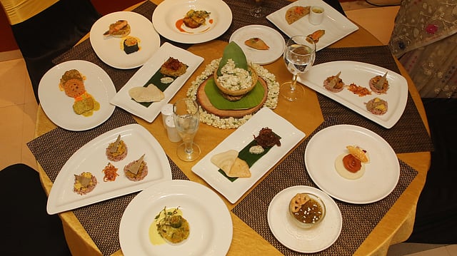 Chef Nayana Afroz’s Tribhorta, a soulful trio of Bengali-style mashed delicacies that paid homage to the essence of home-cooked comfort. The Mashkolai Bori Chingri was particularly memorable, its umami-laden lentil dumplings and prawns blending seamlessly into a velvety mix. The Ilish aar Sheemer Dana, with hilsa and broad bean seeds, carried a depth of flavour that was both rustic and elegant. But it was the Narkel Shorshe—a fresh coconut and mustard mash—that truly stood out, its creamy sharpness cutting through the richness of the meal with finesse. Paired with Hetumari Rice and Bajra Lavoche, this course was a thoughtful nod to Bengal’s love for simple yet profound flavours.