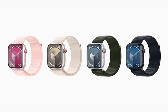 Apple Watch Series 9 is available in 41mm and 45mm sizes in starlight, midnight, silver, (PRODUCT)RED, and a new pink aluminium case, as well as stainless steel in gold, silver, and graphite cases — along with new Sport Loop band.