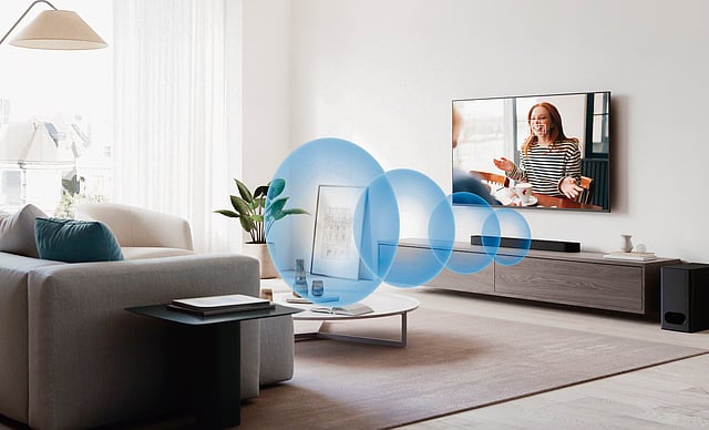Set up under my 65-inch TV, the Theatre Bar 6 is a sizeable piece of kit at 95cm wide and 11cm deep, but it’s low profile enough at 6.4cm to not block the lower part of the TV and light enough at 3.1kg to wall mount without any undue effort. Paired to the ‘bar is a wireless subwoofer that’s quite a bit more substantial (39cm wide and high, 7.7kg) but can be hidden away from view up to 10 feet away. Both are finished off in a matte black with a classy grille.